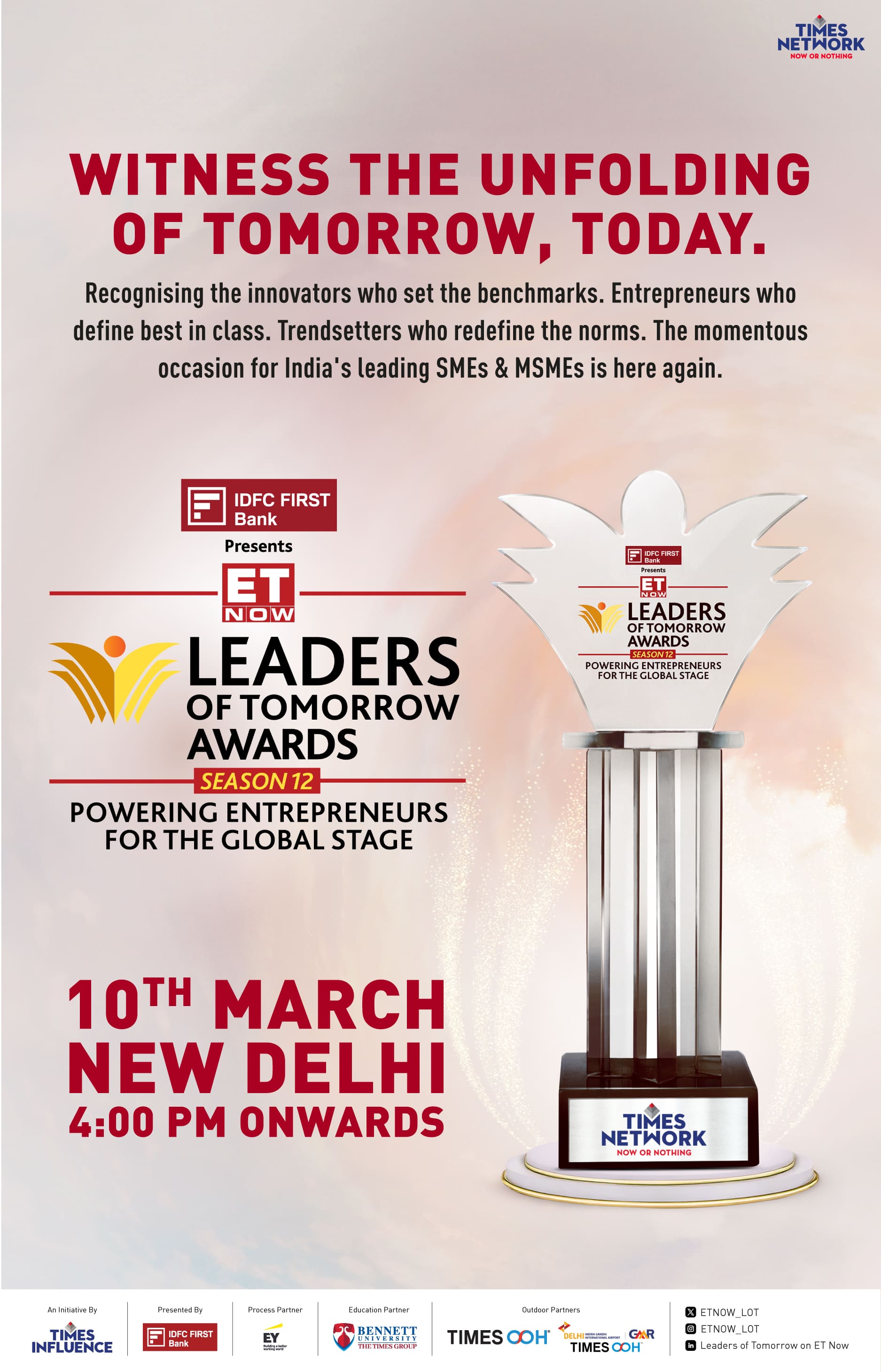 Leaders of Tomorrow Season 12 Awards will continue to spotlight outstanding MSMEs, carry forward its rich legacy. This year, the awards are aligned with our vision to propel India’s global aspirations, embracing the theme: Powering Entrepreneurs for the Global Stage. The Leaders of Tomorrow Season 12 Awards is scheduled to take place in March 2025 as a half-day ceremony in Delhi, attended by over 200 audience members largely comprising of CXOs from large and mid-enterprises.